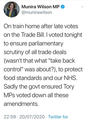 In all honesty, Monday was a real low. Sure, we knew we were going to lose given the parliamentary maths, but it still hurt watching Tory after Tory vote our amendments down. I mean, why wouldn’t you want to stop the NHS being part of any future trade deal? Or keep chlorinated chicken off our tables? No, don’t answer that.