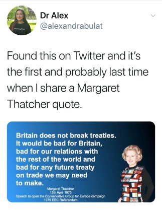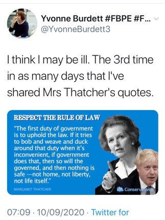 I couldn’t believe my eyes tonight. The Conservative Party — my own beloved party — approving a bill that rides roughshod over the Brexit Withdrawal Agreement and BREAKS INTERNATIONAL LAW. The Lord Chancellor and the Law Officers of England and Wales voting AGAINST an amendment ‘requiring Ministers to respect the rule of law and uphold the independence of the Courts’. For shame!
