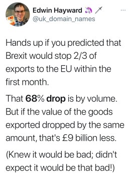 Well, Bob, I’m pretty pleased with how it’s going so far. A 68% drop in goods going to the EU in the space of a year! What fantastic progress.