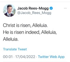 17 April 2022 (Easter Sunday): ‘Rwanda asylum plan is “almost Easter story of redemption” says Rees-Mogg’: https://www.theguardian.com/uk-news/2022/apr/17/uk-asylum-seekers-plan-rwanda-jacob-rees-mogg